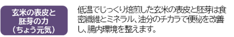 低温でじっくり焙煎した玄米の表皮と胚芽は食物繊維とミネラル・油分のチカラで便秘を改善し、腸内環境を整えます。